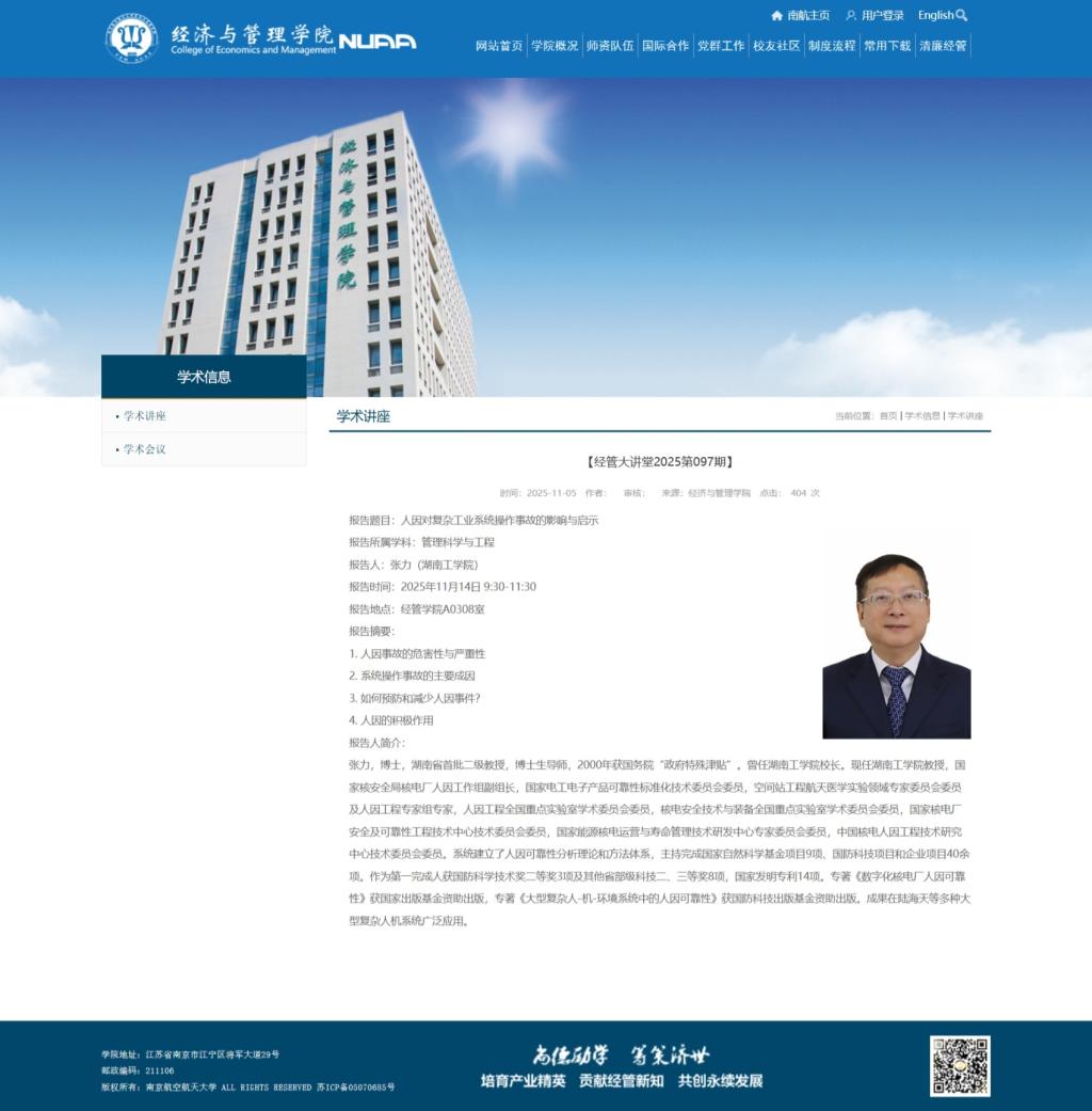 在宁期间,张力教授还受邀分别前往南京理工大学、南京航空航天大学开展学术交流,为两校师生带来两场高水准专题报告。应南京理工大学设计艺术与传媒学院邀请,张力教授作了题为《工业系统人因事故原因与防范》的学术报告;应南京航空航天大学经济管理学院邀请,作题为《人因对复杂工业系统操作事故的影响与启示》学术报告。作为多项国家级科研项目的主持人,张力教授在报告中结合自身深厚的学术积淀与丰富的工程实践经验,系统阐释了复杂工业系统的人因特征及重要作用,并以不同工业领域为例,从不同角度围绕“如何发现、探究与破解复杂工业系统人因层面科学问题”展开深度分享。两场报告逻辑清晰、内容翔实,均引发参会师生的热烈研讨与积极互动。