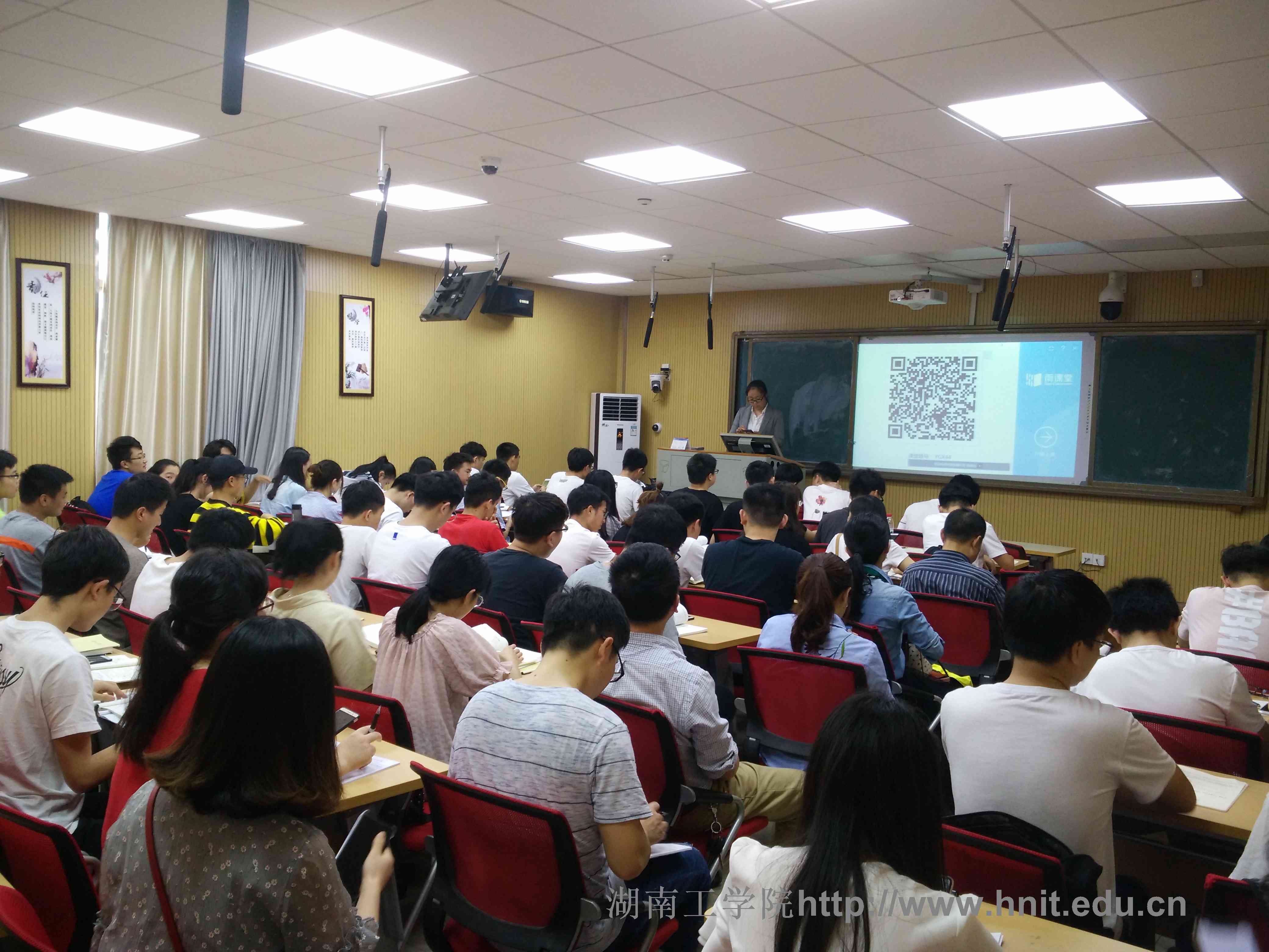 贾雅琼博士上课的是混合式教学改革项目课程《信息与系统》。贾博士在教学现场展示了“讲授实践”、“线上线下”、“课内课外”等结合的混合教学模式,向在座教师直观展示了混合式教学过程,实时反映了她的教学效果及学生的课堂反馈,并就问题提问、作业布置、作业提交时间设置、教学动态信息推送,以及课堂教学节奏掌控等问题与各位教师进行了分享与研讨。同时,也为全体老师做了《四位一体混合式教学的探索与实践》的讲座,以“为什么要开展混合式教学”导入主题,在分析当前教育技术发展现状及教师的困境后,指出时代召唤课堂教学改革,信息技术发展为教学改革提供了优质的资源。讲座中,贾博士聚焦“如何开展线上线下混合教学”和“雨课堂如何助力课堂教学组织与效果”两个问题,将雨课堂软件应用到讲座全程,为在场教师详细解释了有效实施混合式教学所要求的“完善的教学环境支撑、合理的教学流程设计、有效的教学范式重构、多元化的教学过程评价”等关键要素,并现场演示了雨课堂教学软件的使用方法。讲座有效激发了在座教师对混合式教学改革的兴趣。讲座结束后,教师们纷纷咨询混合式教学设计和雨课堂使用等问题