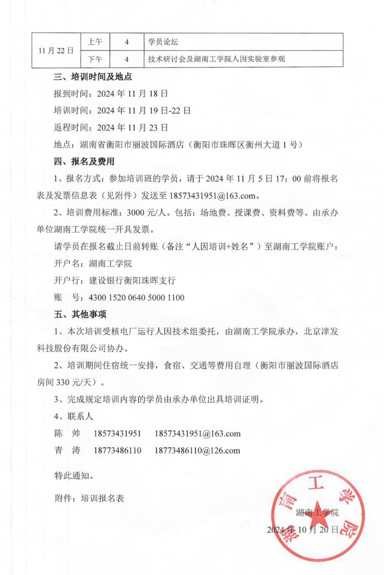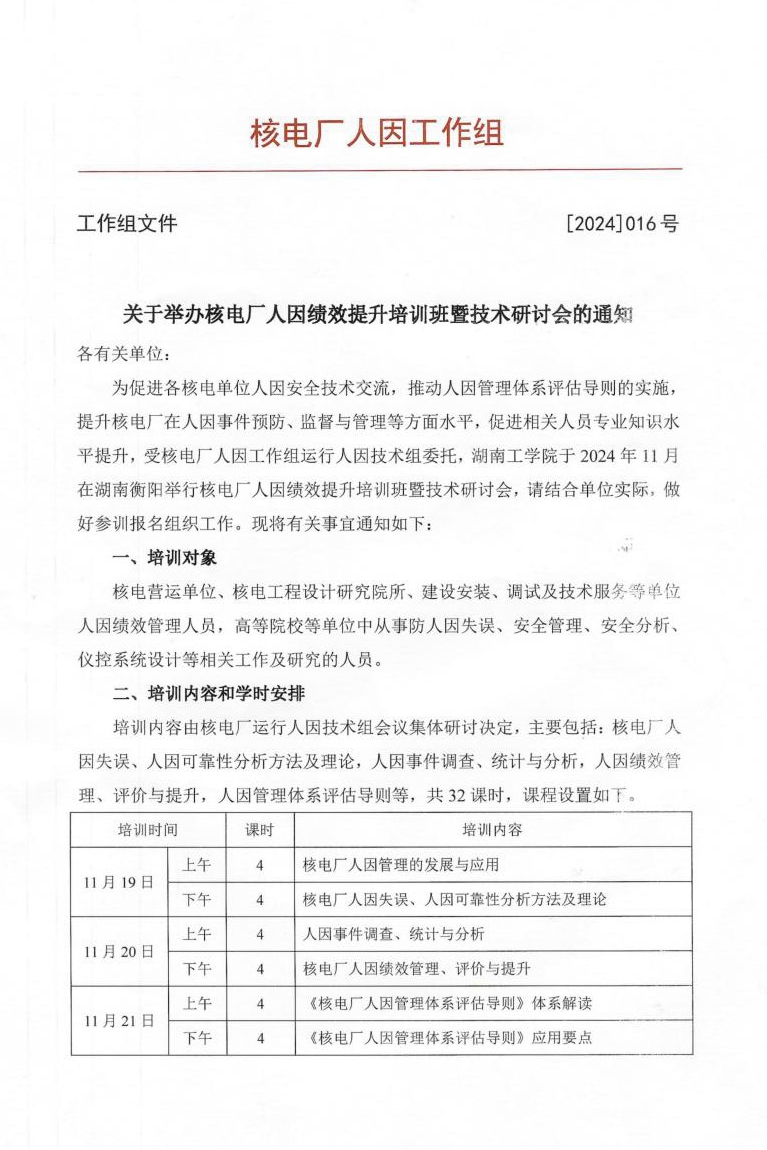 关于举办核电厂人因绩效提升培训班暨技术研讨会的通知