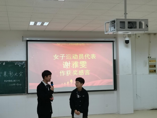 优秀运动员代表谢雅雯、谭小柯依次上台发表获奖感言。他们分享了自己在此次校运会中的体会与收获,对学院的大力支持和工作者们的默默付出表示感谢,并表示将再接再厉,争取在明年校运会上取得更优异的成绩。当主持人提问:“请问是什么支持你带伤并冒雨继续参加比赛,还取得了第一名的好成绩?”谢雅雯坚定地回答:“因为热爱、信念和责任,让我忘记伤痛,坚持为安工的集体荣誉而战。”她的这种永不言弃的体育精神和强烈的集体荣誉感令人为之动容。