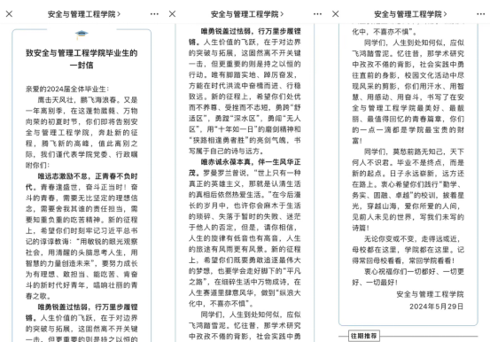 为了表达对毕业生们的深情祝福和殷切期望,学院党委、行政为2024届毕业生准备了一封寄语信,在学院微信公众号官方平台以及学院新闻网上进行推送。学院党委书记陈健、院长胡鸿为毕业生们送上祝福,并希望2024届毕业生们唯远志激励不怠,正青春不负时代;唯勇锐盖过怯弱,行万里步履铿锵;唯赤诚永葆本真,伴一生风华正茂。