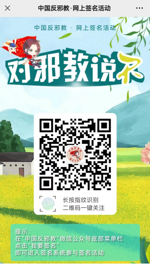 2.关注微信公众号,在中国反邪教微信页面,点击我要签名,进入新页面;