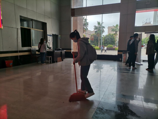 活动初始,每位党员自行备好打扫卫生的工具。且在分工明确的情况下大家各司其职,干劲十足,齐心协力,都积极投入的参与到此次活动过程中,对材化楼大厅的地板、玻璃和桌子进行了全面的打扫清理与消毒,处理各种纸屑和食品包装袋,同时也不放过每一个角落的垃圾和灰尘。充分发挥了党员不怕脏、不怕累的优良作风和团结协作的良好精神,最终在大家的努力下使得材化楼大厅地面舒适整洁,环境焕然一新。