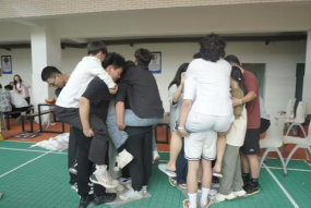 “室外素质团体拓展”—心理健康团体辅导。5月8日,在材化楼3楼平台,心理专家谢玲组织开展了一场大学生团体辅导活动。“你喂我吃,团结友爱”环节,活动要求遮住眼睛给队友递吃香蕉,看哪些队友默契度最高,能顺利吃到美味的香蕉。在“同舟共济,扬帆起航”环节,活动把一张布当成大海的一条船,每组团体成员必须同时站在船上,一个也不能少,并持续将布面积减半。两个活动充分地培养了学生心、脑、手的默契,学生在相互协作中感悟团队的力量,活动现场,气氛热烈,弥漫着欢乐的氛围。