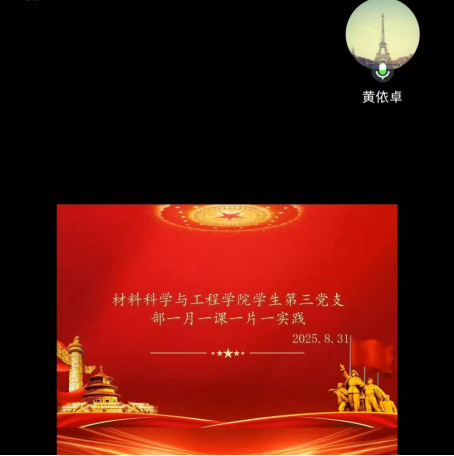 8月31日,材料科学与工程学院学生第三党支部于线上开展八月“一月一课一片一实践”主题党日活动,全体党员参加,支部书记黄依卓主持。
