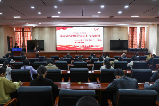 刘升学以民族复兴的政治宣言和行动纲领为题,从宣誓一个主题、展示伟大变革、高举伟大旗帜、明确中心任务、作出战略部署、找到第二答案、坚守底线思维七个方面,对党的二十大精神进行深入解读。