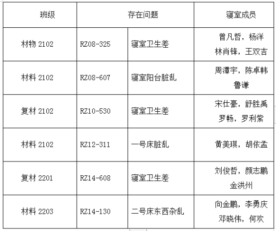 为给同学们营造良好宿舍环境,构建安全温馨寝室,2024年3月18日至3月24日,材料学院宿管部全体成员对我院大一、大二、大三部分寝室进行了检查。现将本周卫生检查问题公布如下:
