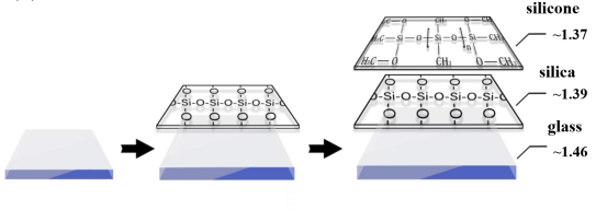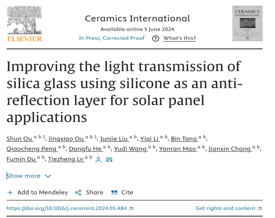 20245月,材料学院新能源材料与器件专业20级学生欧顺,欧景校等多位同学在吕铁铮博士的指导下取得了实验上的重要突破并在Ceramics International SCI一区)期刊上发表了题为《Improving the light transmission of silica glass using silicone as an anti-reflection layer for solar panel applications》的学术论文。该文章创新地引入有机硅作为太阳能电池板的减反层,结构如图1所示。该课题的成果不仅使光伏玻璃表面具有较好的热稳定性,同时相较于原有的基础上,在400~1100nm 波长范围整体提高了约1%的透光率。该研究成果对进一步提高光伏应用端转换效率,降低发电成本有着实际的指导意义。