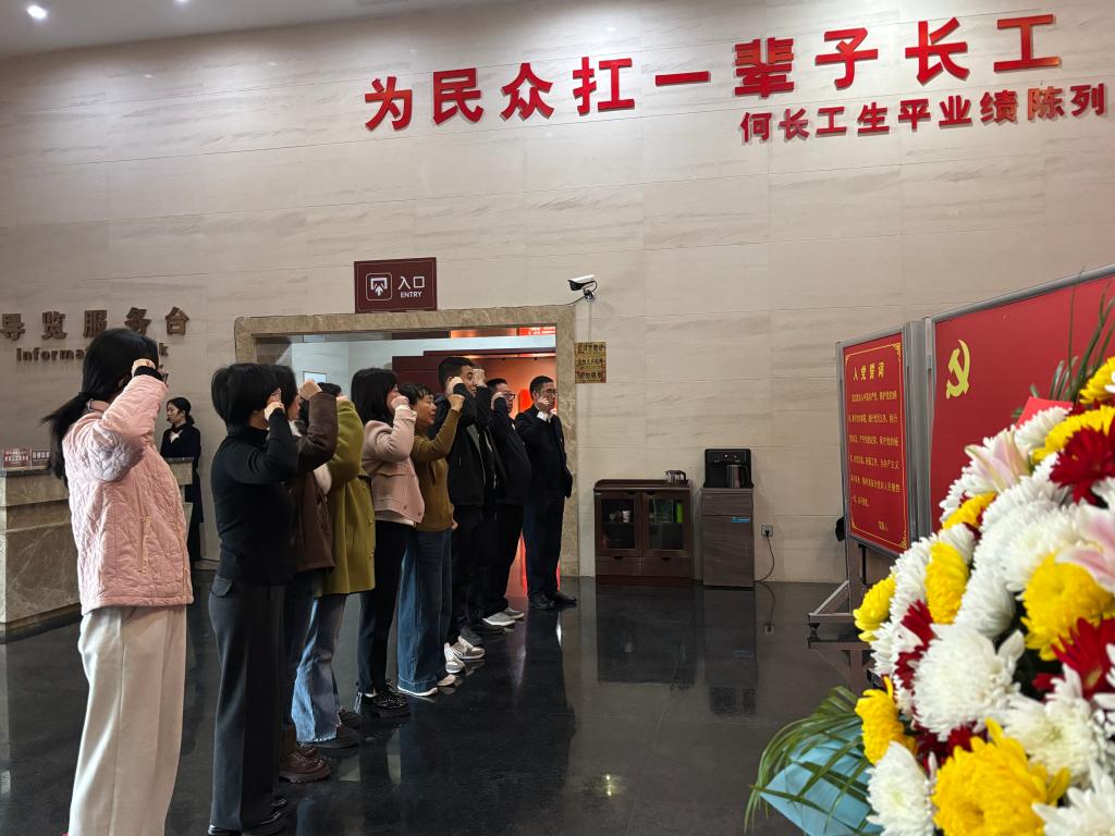 随后,同志们怀着崇敬的心情步入展厅。在讲解员的深情讲述下,何长工同志波澜壮阔的革命生涯清晰再现:从早期投身工人运动,到参与秋收起义、设计制作中国工农革命军第一面军旗、促成井冈山“朱毛会师”,再到新中国成立后为教育事业和地质工作呕心沥血。一幅幅历史照片、一件件珍贵文物,生动展现了这位老一辈革命家对党忠诚、勇挑重担、廉洁奉公的崇高风范。党员们凝神观看,深切体悟何长工同志“功高不自居,位高不自显”的宝贵精神。