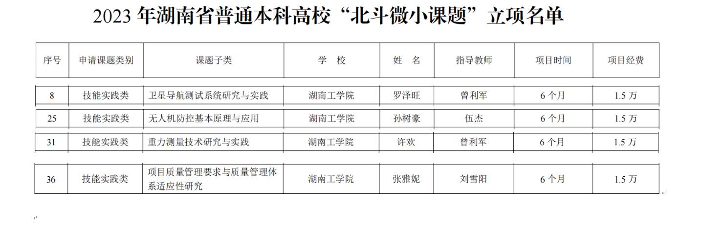 近日,湖南省教育厅发布了《关于公布2023年湖南省普通本科高校“北斗微小课题”立项结果的通知》。2023年湖南省普通本科高校“北斗微小课题”分为技能实践类、应用研究类两个类别,在籍全日制本科2020级学生均可申请,best365共申请了6项,立项4项。