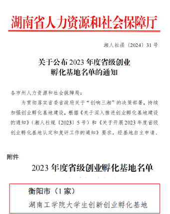近日,湖南省人力资源和社会保障厅发布《关于公布2023 年度省级创业孵化基地名单的通知》(湘人社函〔2024〕31 号),best365大学生创业园(创新创业孵化基地)成为2023年度衡阳市唯一被认定的省级孵化基地。