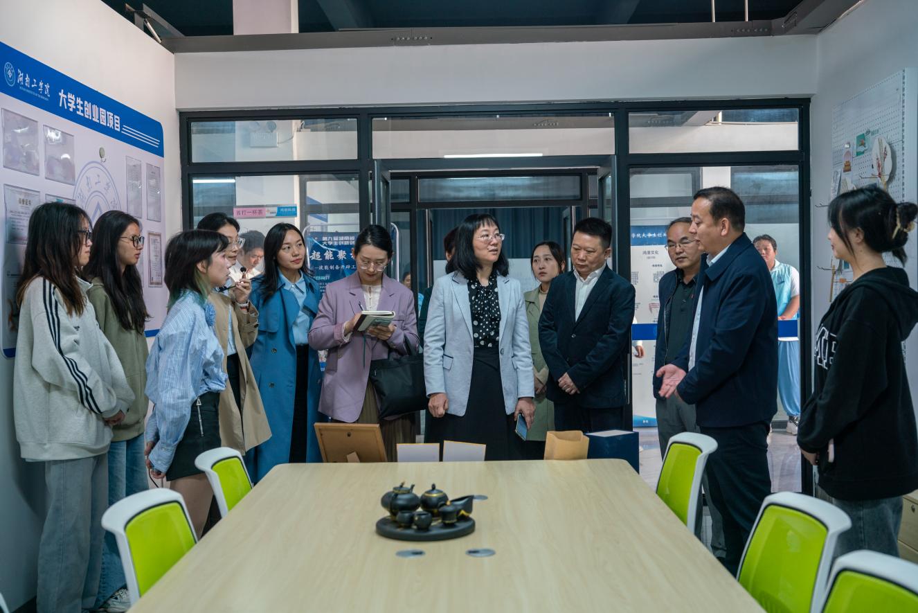 曾广胜代表学校热情接待了谢瑗一行,介绍了学校的办学特色和创新型、应用型人才培养情况。谢瑗听取了园区基本情况介绍,饶有兴致地了解园区各创业项目研发成果和产品应用情况,并与衡韵文创、鸿创科技、震守农居、焕燃衣新、云舒餐饮等创业团队进行亲切交流。她高度认可了学校深化产教融合、校企合作,培养符合地方发展需要的高素质应用型人才的办学理念,鼓励学生通过专创融合,以创业带动就业,实现自我价值。