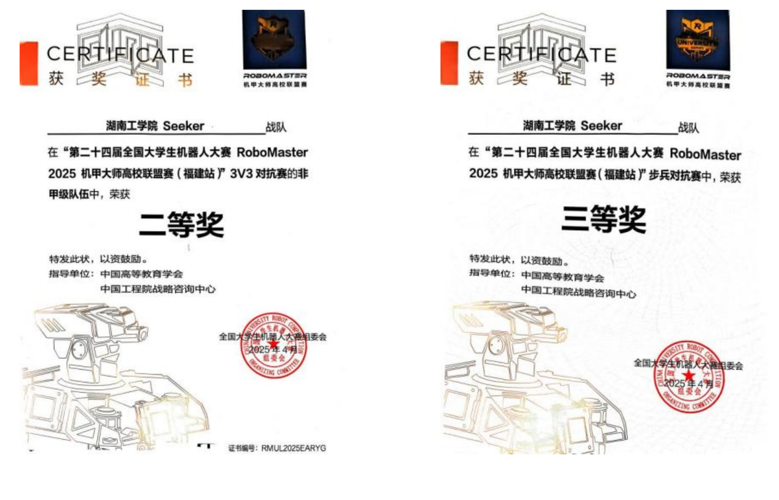 best365中国官方网站由林泽鑫、孙国庆等14位同学组建的Seeker战队获“机器人3V3对抗赛”二等奖1项、“步兵机器人对抗赛”三等奖1项,团队英雄机器人获得机器人竞技奖二等奖1项,哨兵机器人获得机器人竞技奖二等奖1项,步兵机器人获得机器人竞技奖三等奖1项。