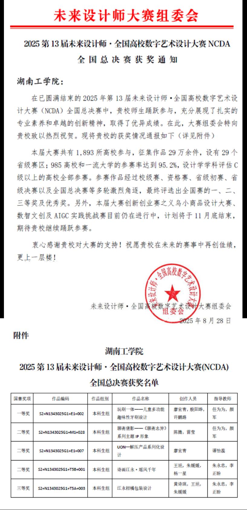 近日,第13届未来设计师–全国高校数字艺术设计大赛落下帷幕best365共获得全国赛一等奖1项、二等奖3项、三等奖1项;省赛一等奖5项、二等奖16项、三等奖15项,12位老师分别获得全国赛和湖南省赛区“优秀指导教师”,再次刷新best365在此项赛事上的获奖记录。其中,廖宏青、殷阳晔、许鹏路同学的参赛作品《玩刷一体——儿童多功能趣味性牙刷设计》在全国赛中获得一等奖;陈腾、雷莹的参赛作品《聊斋倩影——<聊斋志异>系列主题IP 形象》、廖宏青同学的参赛作品《UON—解压产品系列化设计》及王旭、朱媛媛、杨一星同学的参赛作品《诗画江永·瑶风千年》获全国赛二等奖;黄诗琪、王旭、朱媛媛同学的参赛作品《江永柑橘包装设计》获全国赛三等奖。