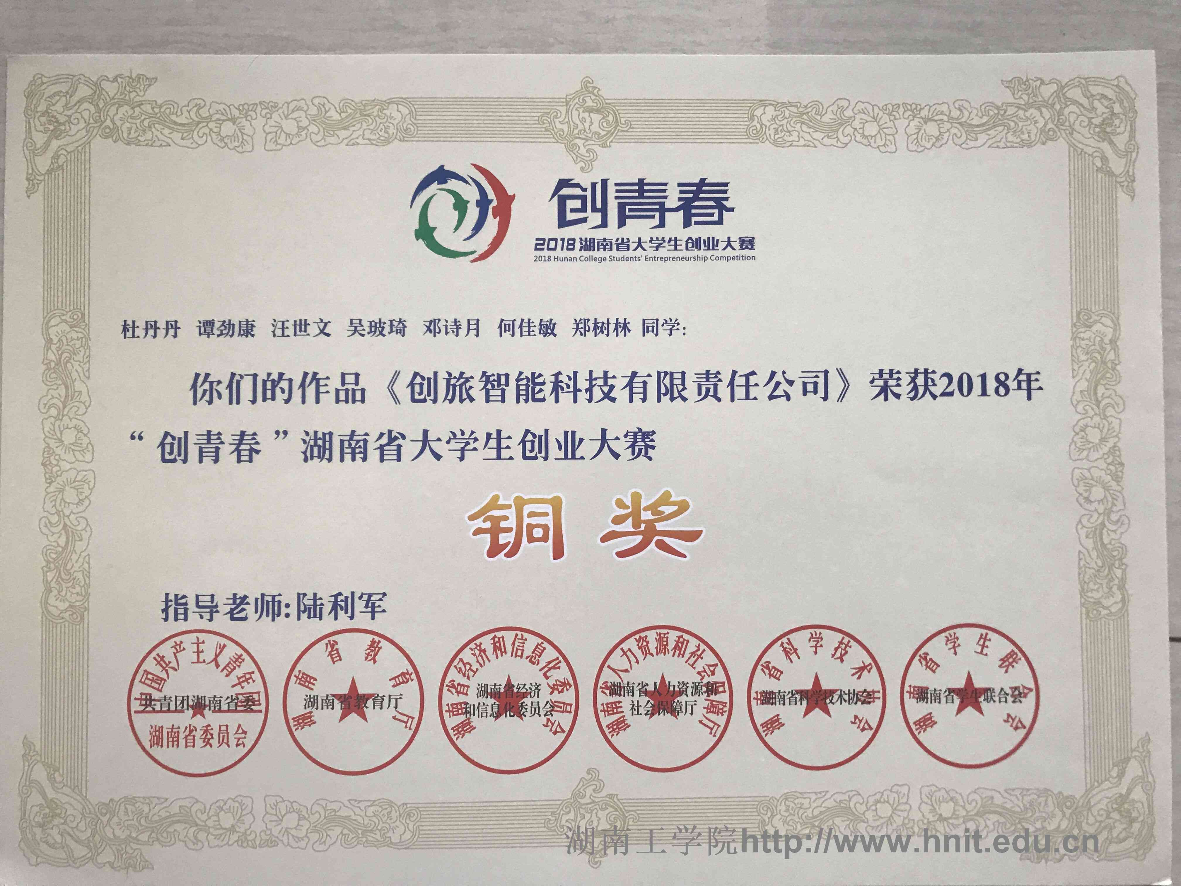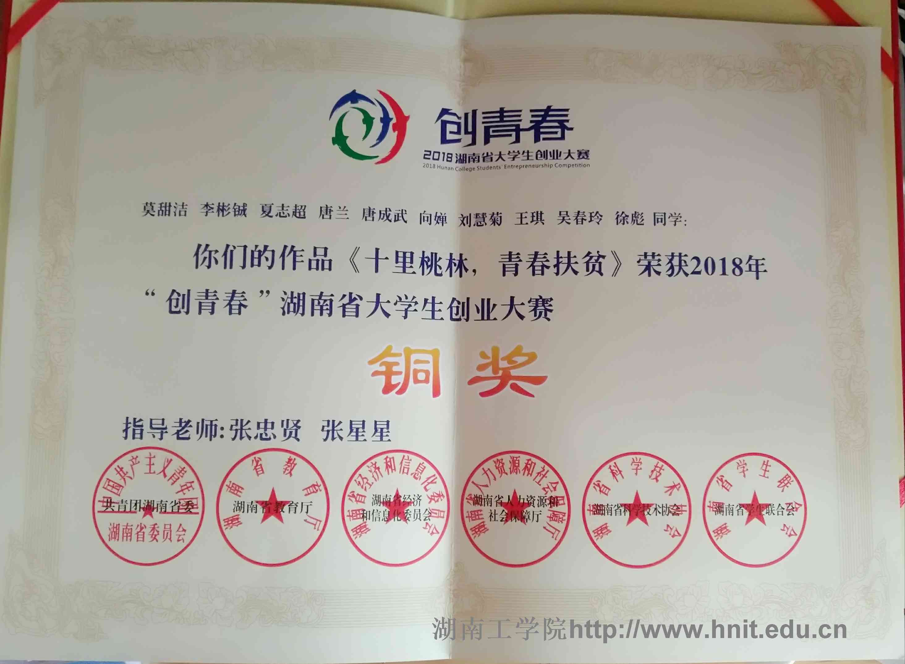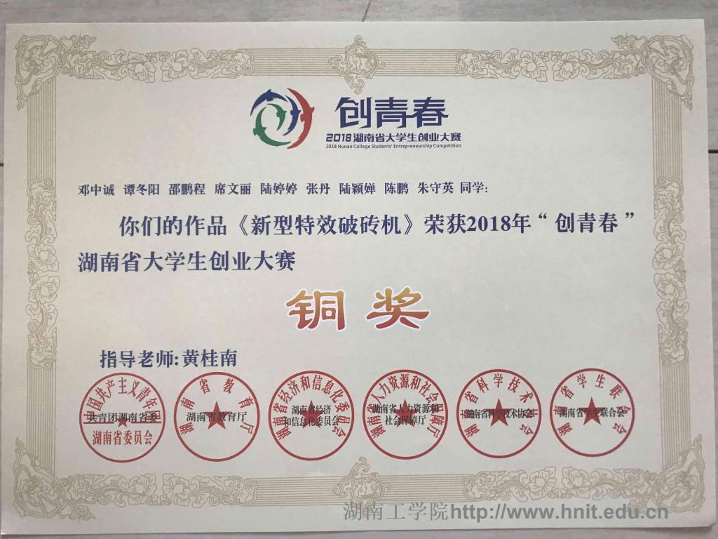 2018年创青春湖南省大学生创业大赛荣誉证书