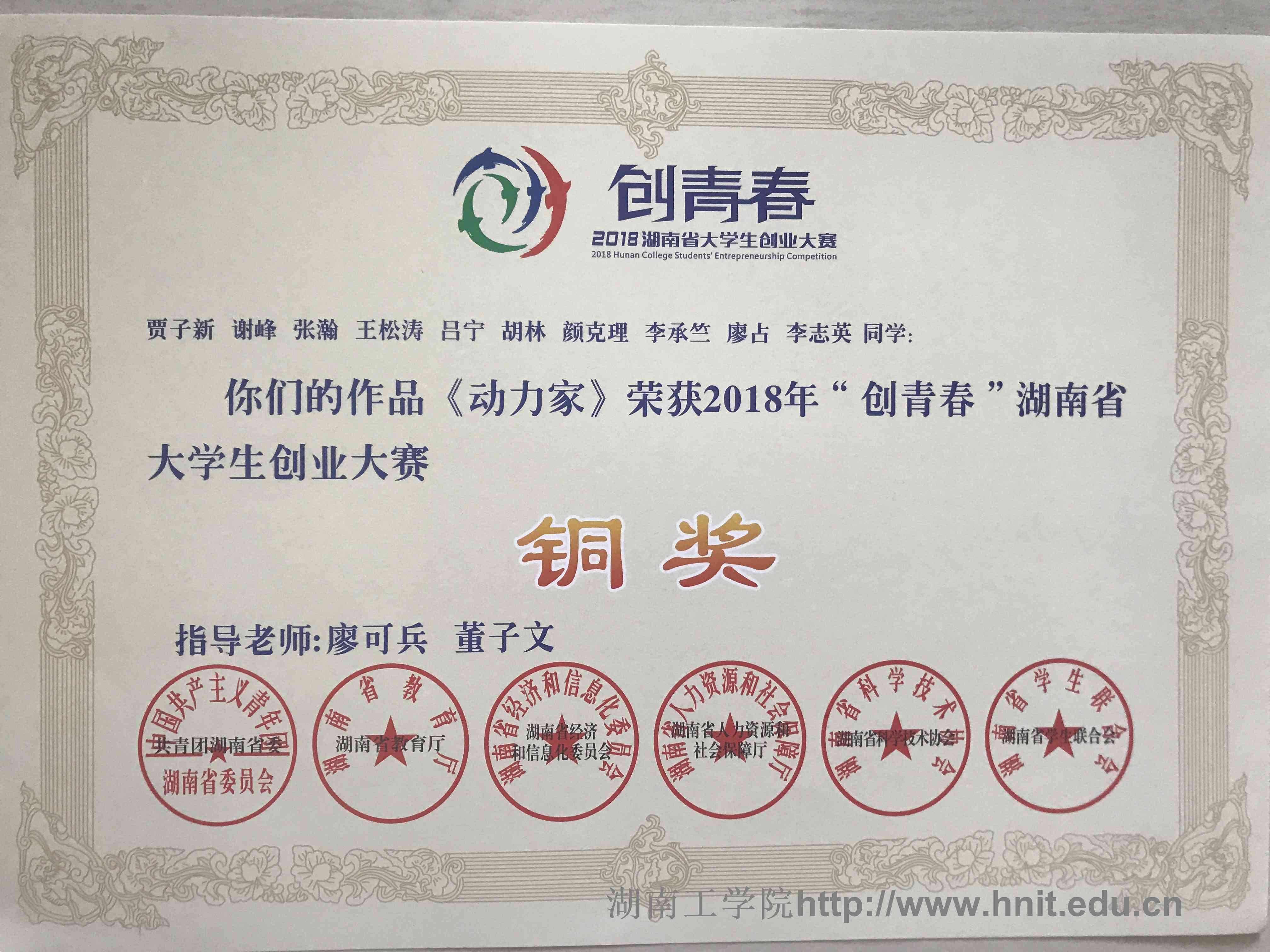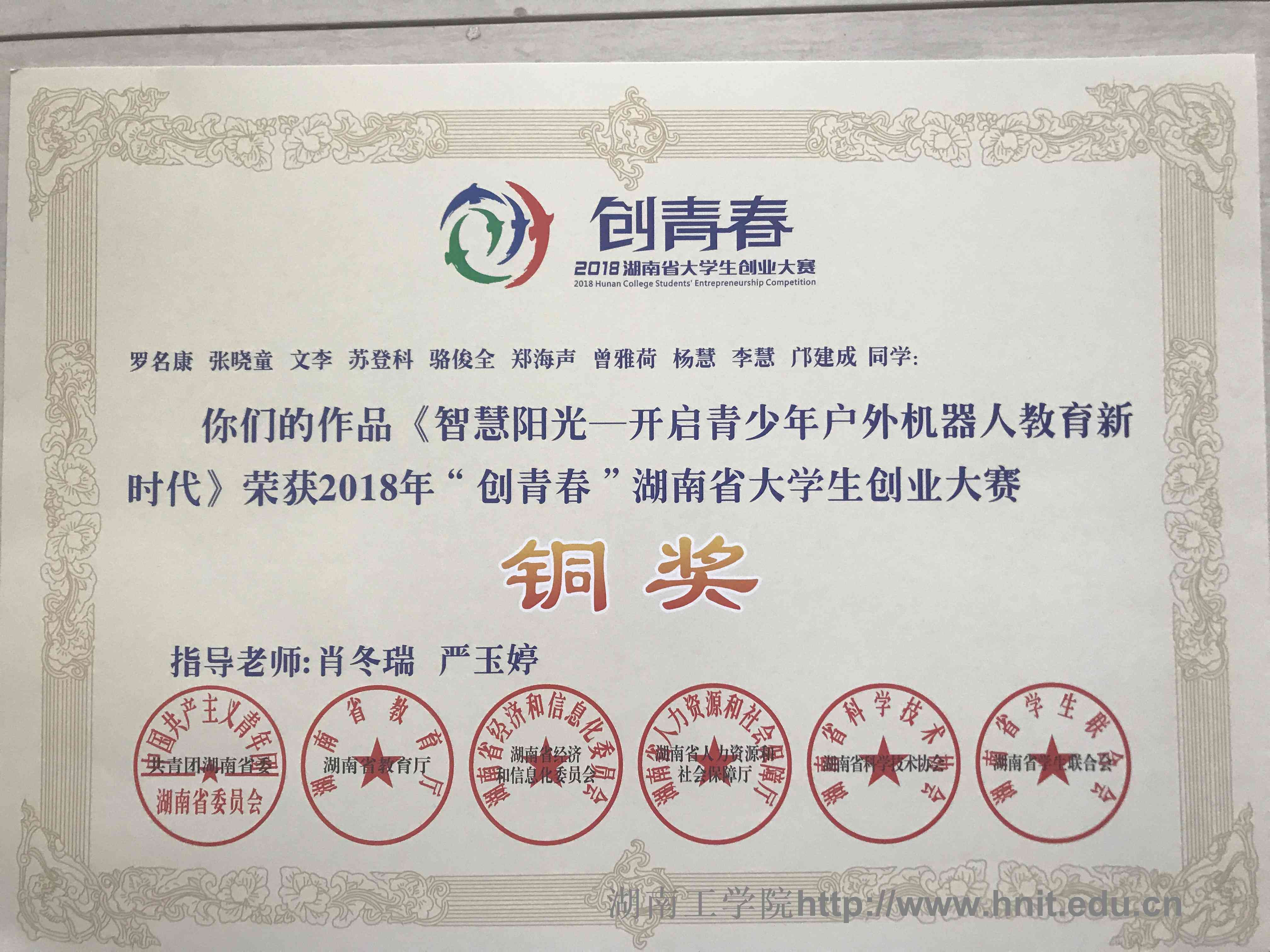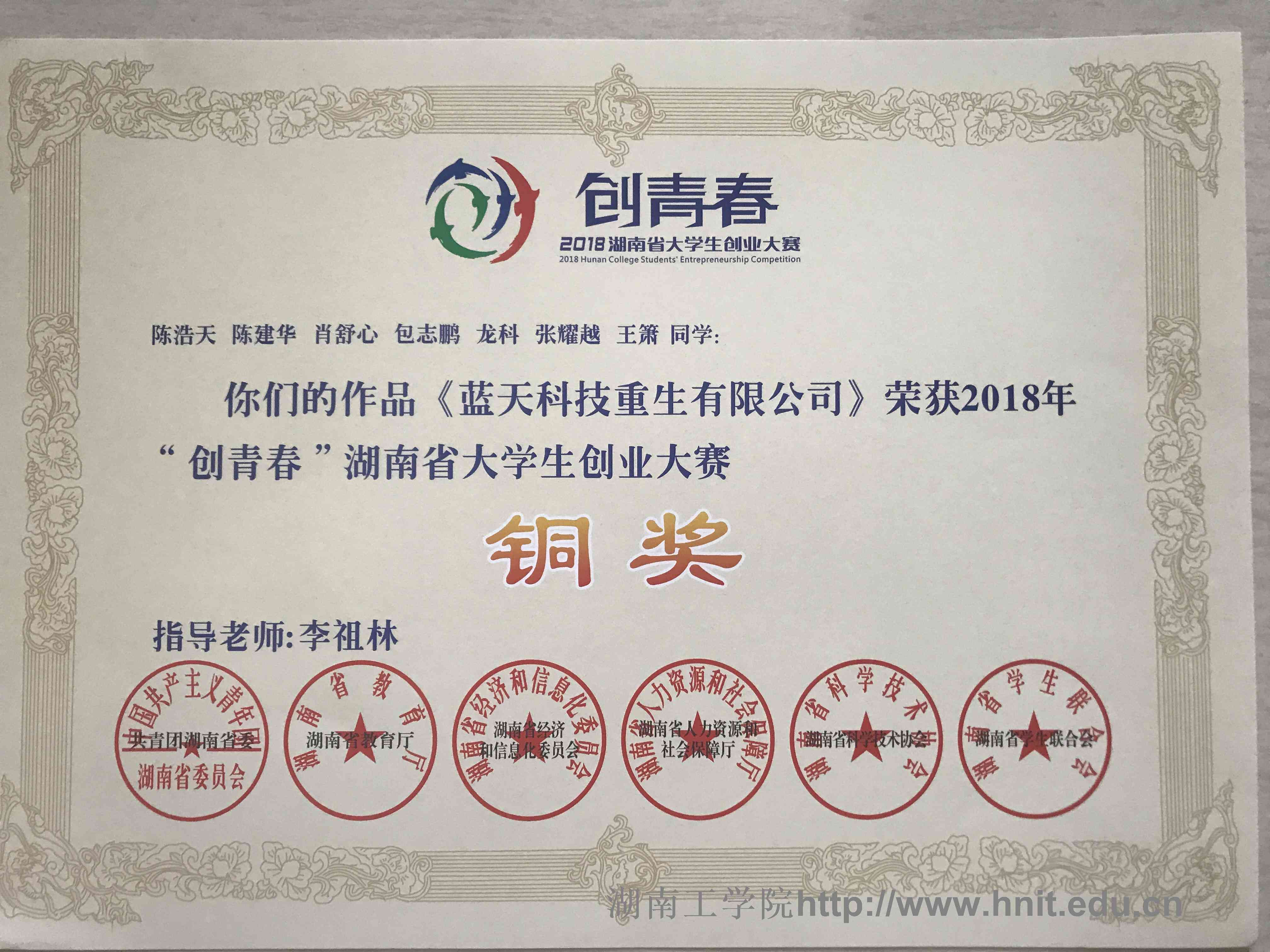 2018年创青春湖南省大学生创业大赛荣誉证书