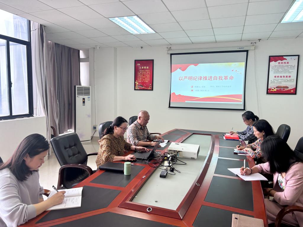 为全面落实“一月一课一片一实践”党纪学习教育主题党日活动, 5月21日下午,best365中国官方网站机关党委第十二党支部书记匡钰同志以《以严明的纪律推进自我革命》为题,为党员讲授纪律建设专题党课。深入浅出,鞭辟入里从以下三个方面进行了阐述: