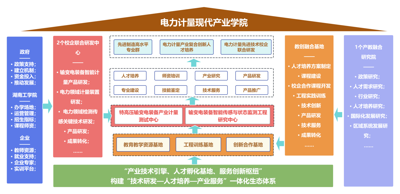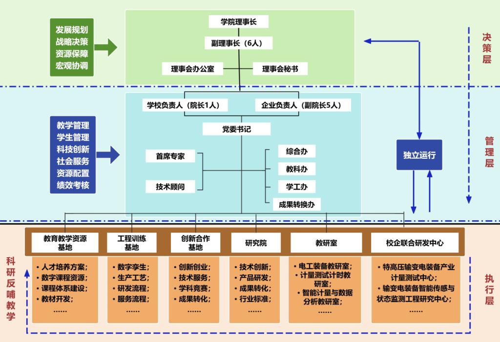 3个专业教研室:电工装备教研室、计量测试技术教研室、智能计量与数据分析教研室;1个产教融合研究院:负责相关政策研究、行业发展研究、人才需求研究等;2个校企联合研发中心:特高压输变电装备产业计量测试中心(已成立)、输变电装备智能传感与状态监测工程研究中心(已挂牌),负责电力计量产品研发。3个教创融合基地:教学资源基地、工程训练基地、创新合作基地,负责人才培养方案制定、课程建设、校企合作课程开发、工程实践训练、技术创新、产品研发、技术服务、成果转化等。