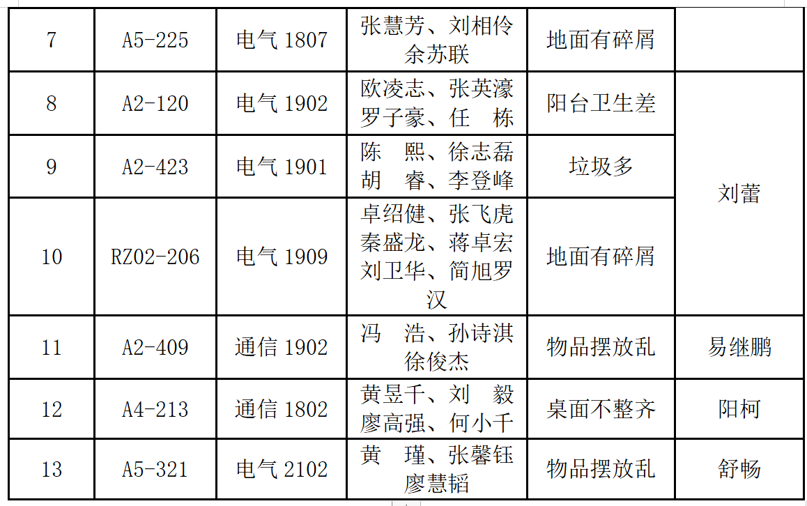 2021年下半年文明宿舍建设活动第十一周,我院“文明宿舍创建活动”工作组本着“公平、公正、公开”的原则,对我院全部宿舍进行了彻底检查。现将检查结果公布如下: