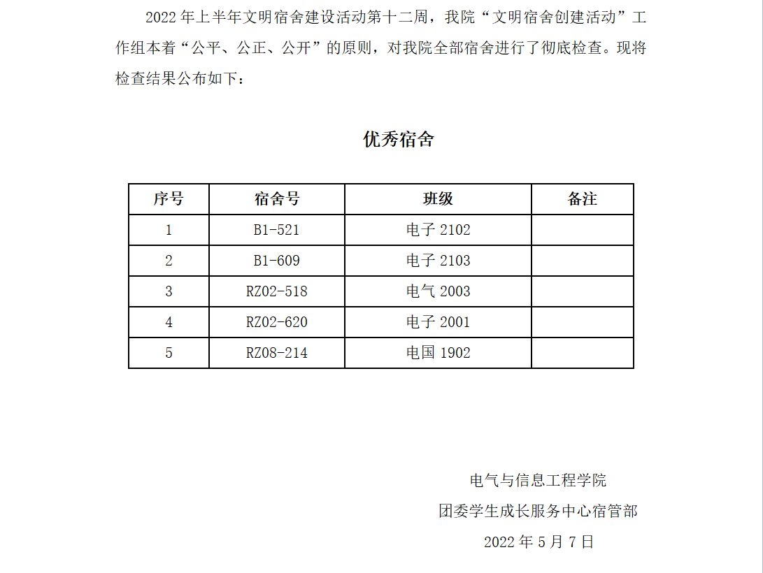 2022年上半年文明宿舍建设活动十二周优秀宿舍