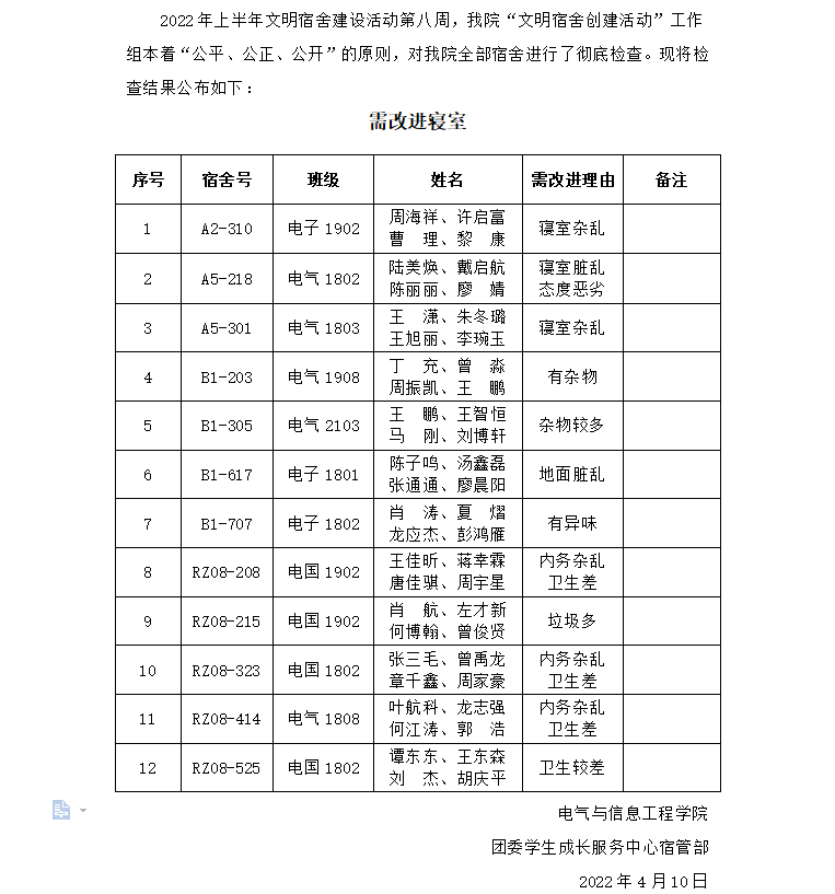 2022年上半年文明宿舍建设活动第八周需改进宿舍