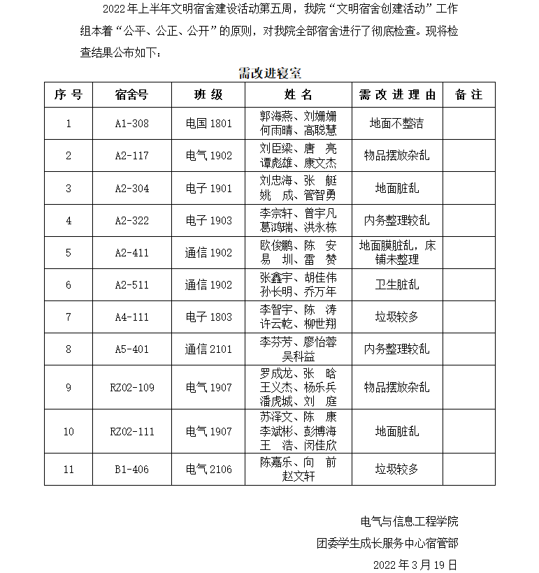 2022年上半年文明宿舍建设活动第五周需改进宿舍