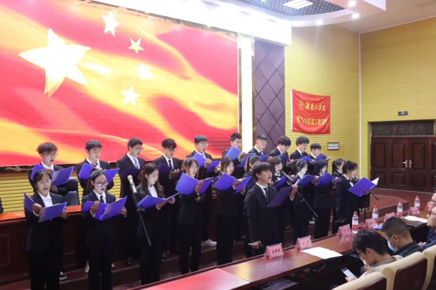 第十五届团委学生会团委副书记唐袁袁做就职演讲,对我院未来一年的团学工作进行规划。她表示将坚持以服务学生群体为导向,加强学生干部队伍建设,推动团学工作再上新台阶。第十五届团委学生会轮值主席刘硕带领新一届团学干部宣誓,随后由新一届团学干部带来朗诵《红旗颂歌》。