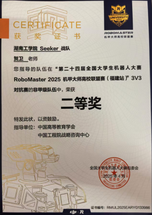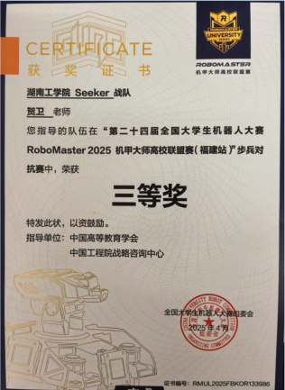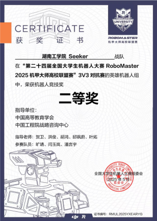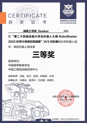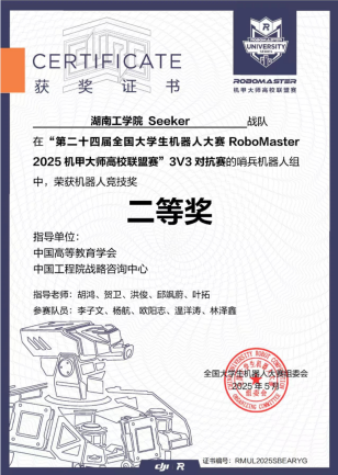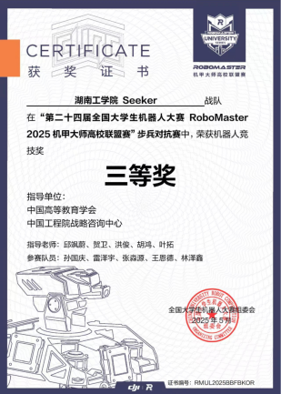 Seeker战队成立于2024年,首次参赛中便崭露头角,荣获2024赛季步兵对抗赛国家一等奖。2025年best365Seeker战队荣获3V3对抗赛二等奖,步兵对抗赛三等奖;并凭借卓越的机器人性能在机器人竞技奖中荣获二等奖两项,三等奖两项。(比赛链接视频:https://b23.tv/52EQ0qm)