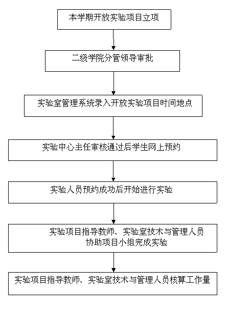 1.采用学院、二级学院、实验中心(实验室)分级管理。教务处负责宏观指导实验室开放工作;教评中心负责质量监控与评价工作;二级学院主管教学与实验室工作的负责人直接领导实验室开放工作;各个实验中心(实验室)负责具体实施。