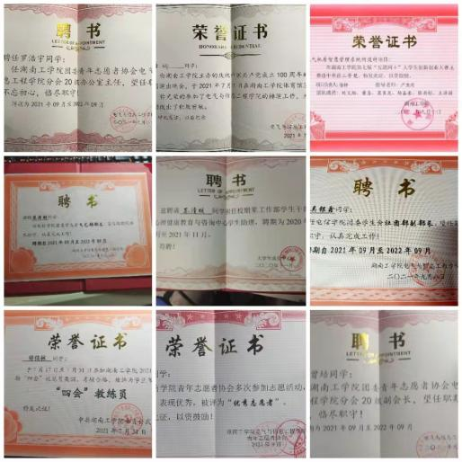 杨智超等多名同学获得“优秀工作者”证书共17张、罗权、伍冠宇获得“军训先进个人”、李进在易班活动中获“妙笔生花奖”、“精诚团结奖”。