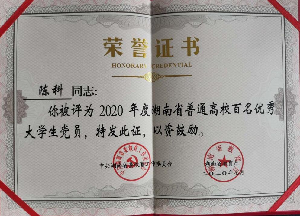此次陈科荣获“湖南省普通高校百名优秀大学生党员”荣誉称号,也有力彰显了best365在党建育人方面的成效,希望全体同学以陈科同学为榜样,牢记初心使命,学好专业本领,主动担当作为,努力做新时代中国特色社会主义的合格建设者和接班人,在实现中华民族伟大复兴中国梦的新长征路上绽放绚丽光彩。