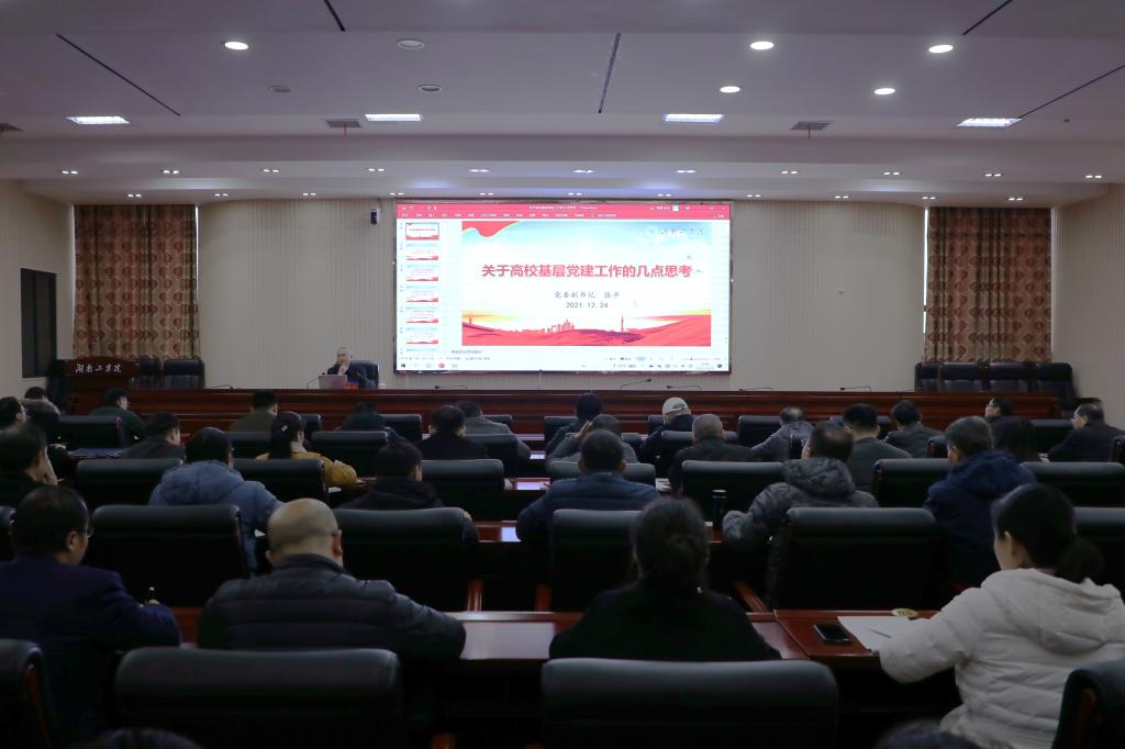 张平以《关于高校基层党建工作的几点思考》为题,结合工作实际,从“坚持问题导向,清醒认识当前高校基层党建工作形势与现状”“以《条例》为旨向,对标对表,深入落实新时代党的组织路线”以及“坚持守正创新,以高质量党建引领学校高质量快速发展”三方面作深刻解读。