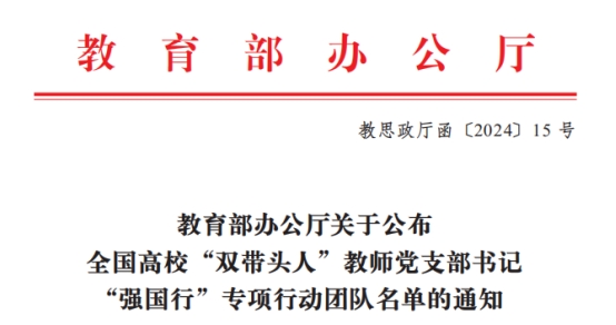 据悉,全国高校“双带头人”教师党支部书记“强国行”专项行动旨在创新落实立德树人根本任务,全面增强高校教师党支部的政治功能和组织功能,充分发挥党支部战斗堡垒和党员先锋模范作用,突出师生共育、教学相长,引领广大师生在服务国家重大战略和地方经济社会高质量发展中,深刻认识新时代党和国家事业取得的历史性成就、发生的历史性变革,深入了解党情、国情、社情、民情,为强国建设、民族复兴作出更大贡献。入选的“双带头人”将重点在开展党建联建、提供教育服务、推动科技赋能、深化实践育人四个方面加强探索实践并产出高水平成果,建设周期为3年。(图文/ 段思遥)审稿人/一审:王安东 二审:段磊 三审:杨朗