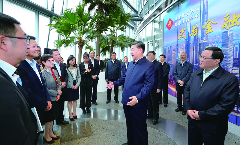 2018年11月6日至7日,中共中央总书记、国家主席、中央军委主席习近平在上海考察。这是6日上午,习近平在上海中心大厦22层的陆家嘴金融城党建服务中心,同正在联合开展主题党日活动的企业党员亲切交谈。 新华社记者 谢环驰/摄