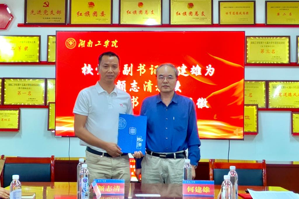 校党委副书记何建雄为颜志清颁发客座教授聘书并讲话。他指出,校友是学校发展的宝贵资源,颜志清校友从“湖工学子”到“企业领军人”的奋斗历程,生动诠释了“勤学 务实 圆融 卓越”的校训精神。此次聘任既是校友反哺母校的典范,也是学院推进“双师型”师资队伍建设、强化校企协同育人的重要举措。他寄语学院以此次合作为契机,深化行业对接,不断提升应用型人才培养质量。