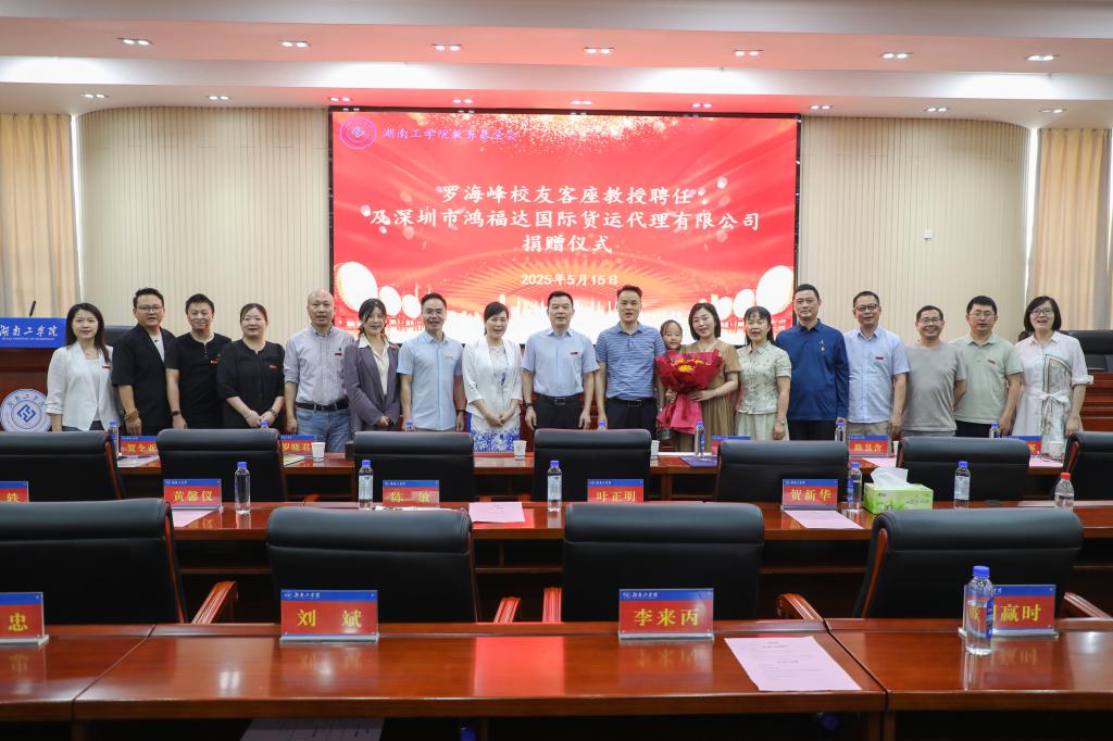 2025年5月15日,罗海峰校友客座教授聘任仪式及深圳市鸿福达国际货运代理有限公司捐赠签约仪式在船山报告厅举行。校党委书记曹执令,党委委员、纪委书记王艳琼出席仪式。深圳市鸿福达国际货运代理有限公司董事长、2004届计算机网络与通讯技术专业罗海峰校友携夫人出席。大会由校友联络中心主持。