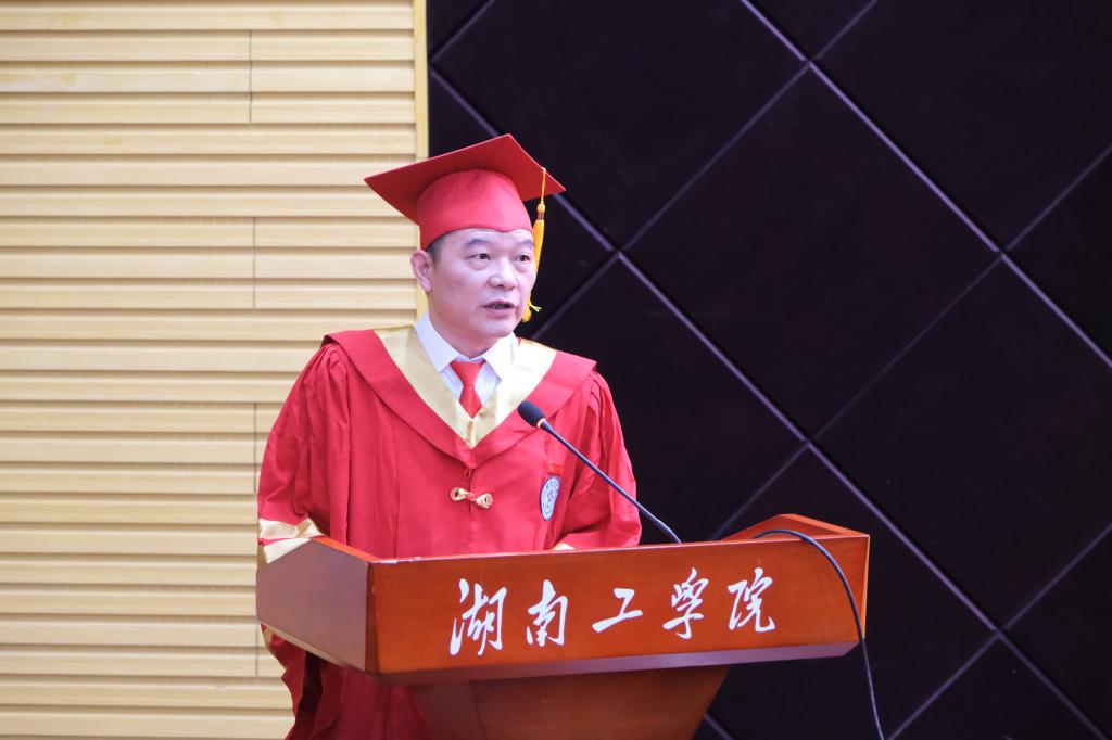 校党委书记曹执令以《新质·新程》为题,向毕业生致以诚挚祝福,并寄予殷切期望。他指出,2025届毕业生是祖国发展进程的亲历者,是学校蝶变历程的见证者,更是湖工荣光的创造者。他以“三个新”与毕业生共勉:一是“新”在创新胆识,希望同学们敢闯“无人区”,勇当“跨界者”,甘坐“冷板凳”,做破壁求变的开拓者;二是“新”在奋斗姿态,勉励大家坚持“向下扎根、向上生长”,在平凡中淬炼卓越,做脚踏实地的实干家;三是“新”在格局胸怀,鼓励大家心怀“国之大者”,以青春之“新质”服务中国式现代化之“新程”,做家国情怀的追梦人。在学校即将迎来建校50周年之际,曹执令书记诚挚邀请广大毕业生回母校看看,见证学校改革发展的新篇章。