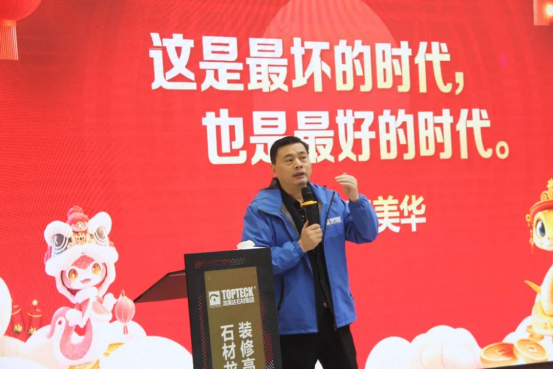 (图:龙美达石材集团董事长龚美华在公司大会演讲)