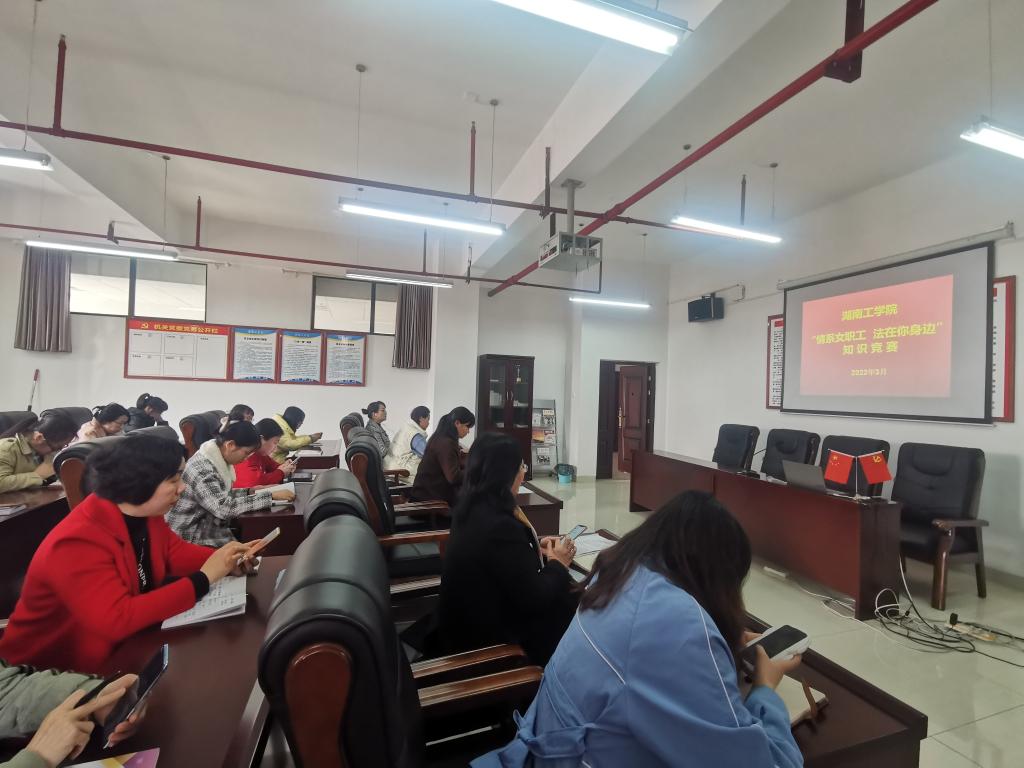 3月3日下午,校工会女职工委员会召集19个分工会的女工委员,在教学大楼509会议室开展培训和竞赛答题。赛前,女职工委员会主任阳萍详细讲解了知识竞赛活动要求,各分工会的女工委员通过微信、QQ工作群及时进行了传达。女教职工参与性很高,积极通手机微信平台参与知识竞赛。赛后,阳萍主任带领大家认真学习了《湖南省女职工劳动保护条例规定》宣传读本,积极引导女职工增强学法、知法、懂法、守法、用法意识,鼓励女职工运用法律武器来维护自身合法权益。