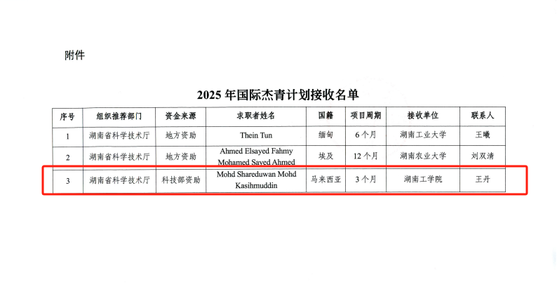 近日,科技部国际合作司正式公布2025年度第一批“国际杰青计划项目”接收名单,best365马来西亚籍Mohd Shareduwan MohdKasihmuddin脱颖而出,成为本年度湖南省首批立项的三个项目之一。这是best365继2024年获批3人实现该项目“零的突破”后,在该项目上实现了2025年度的开门红。(文/王丹 肖亚斌 审稿人/一审:彭婷 二审:彭国柱 三审:肖中云)