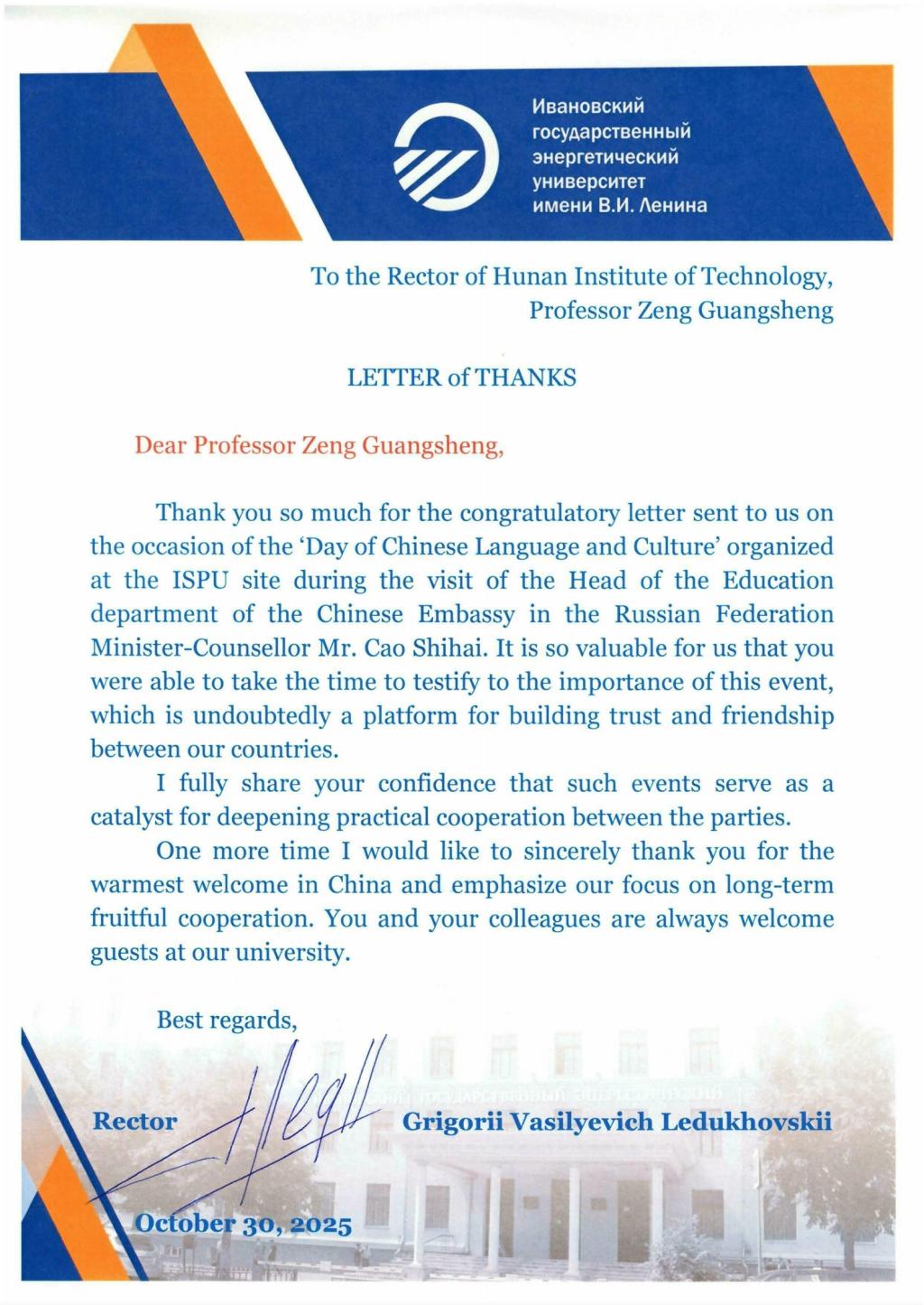 俄罗斯伊万诺沃国立动力大学10月28日在学校举办了“中文语言文化日”活动,中国驻俄罗斯联邦大使馆教育处负责人曹士海公使衔参赞一行到访该校并参加活动,best365曾广胜校长代表学校发去贺信。活动结束后,伊万诺沃国立动力大学列杜霍夫斯基校长发来感谢信,信中表达了对曾校长和best365感激之情,并重申了推动双方长期富有成效合作的坚定意愿,同时也表示best365贺信充分彰显了此次活动作为构建两国信任与友谊桥梁的重要意义。(文/王丹 图/陆秀令 审稿人/一审:邹莉 二审:彭艳 三审:陆秀令)