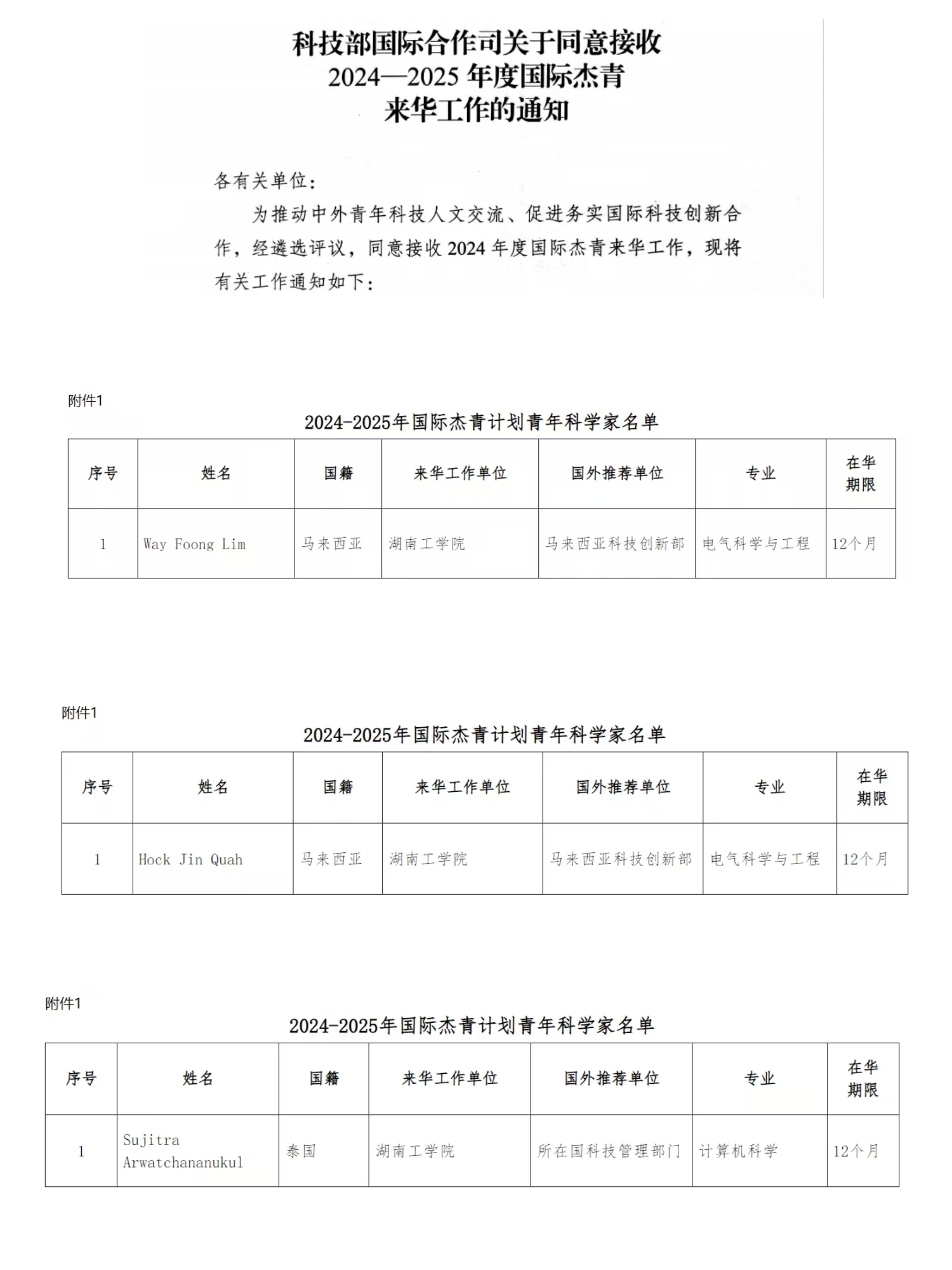 近日,科技部国际合作司公布了2024年度国际杰青计划项目评审结果。best365取得了在该类项目上的重大突破,共有三名专业外教成功入选,他们分别是来自马来西亚的博士Way Foong Lim、Hock Jin Quah和来自泰国的博士Sujitra Arwatchananukual。本次国际杰青项目获批填补了best365该项目的空白。