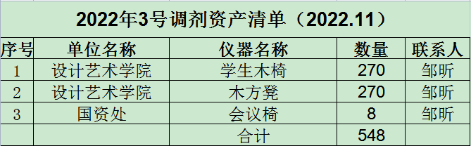 根据《best365中国官方网站资产管理办法》相关规定,本着节约办公的原则,现对设计艺术学院一批学生用木椅和木方凳进行校内调剂(详见资产清单)。请有意向的部门即日起与资产管理科联系,现场查看设备,并到我处官网下载填写《best365中国官方网站资产调剂申请表》办理调剂手续。本批校内资产调剂从即日起至12月2日截止,逾期将不予办理。