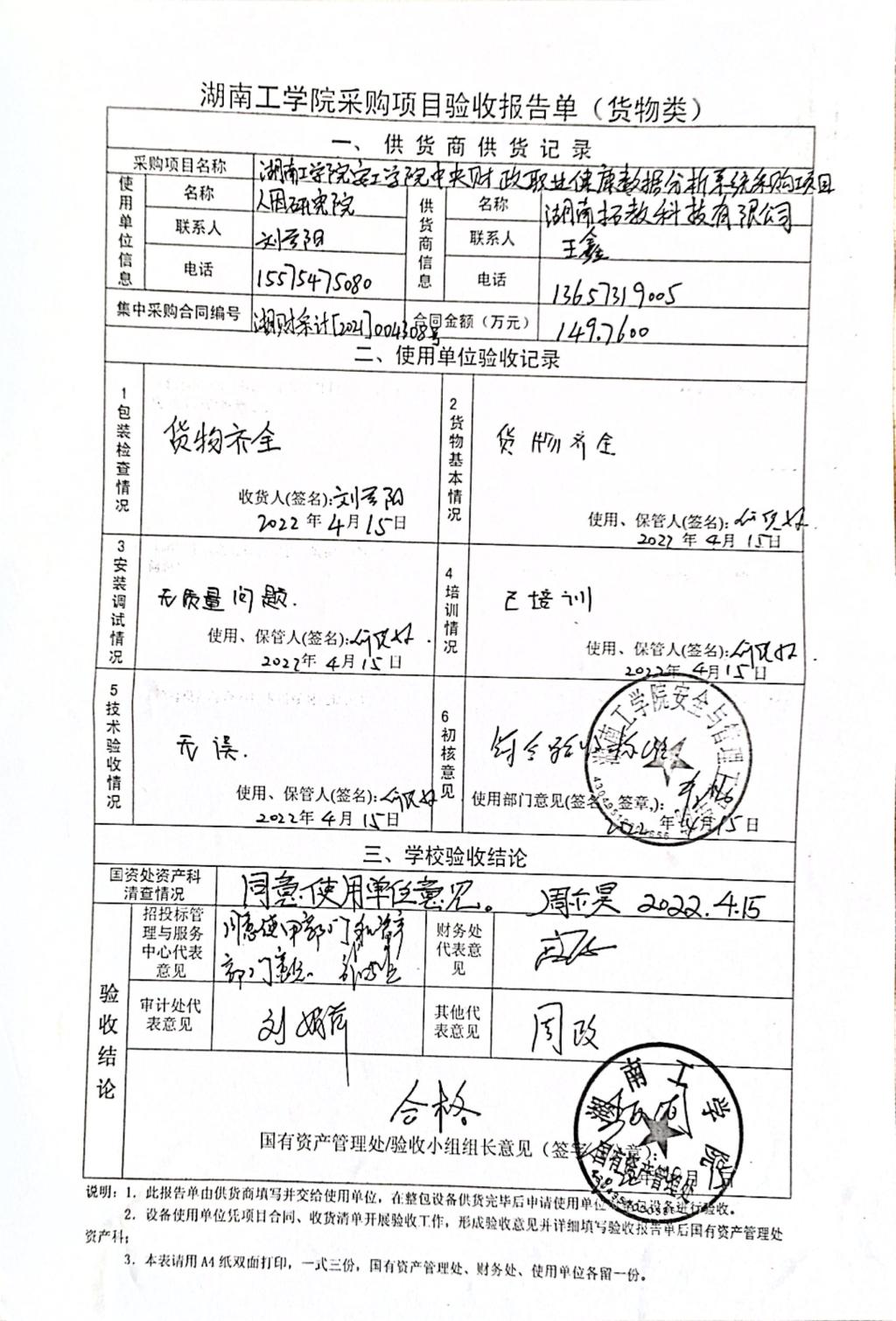 根据国有资产管理处对采购项目的验收安排,2022年4月15日国有资产管理处组织招投标管理与服务中心、审计处、财务处、学科建设与发展规划处以及使用部门代表对供应商的货品进行现场验收。