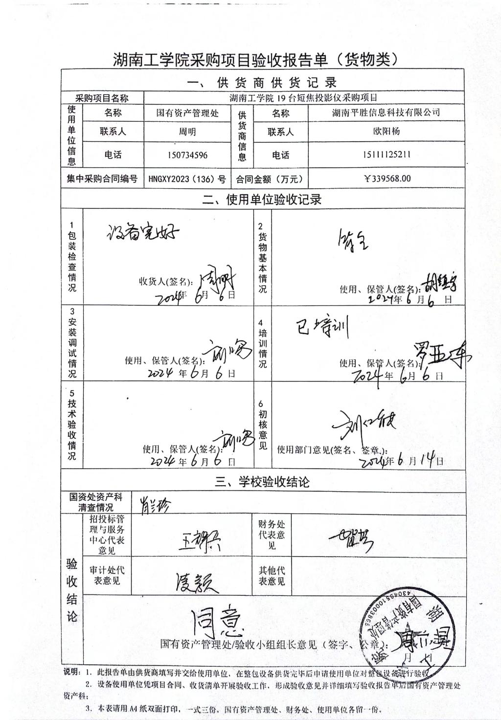 2024年6月关于HNGXY2023【136】号 购字2023【67】号采购项目验收情况公告