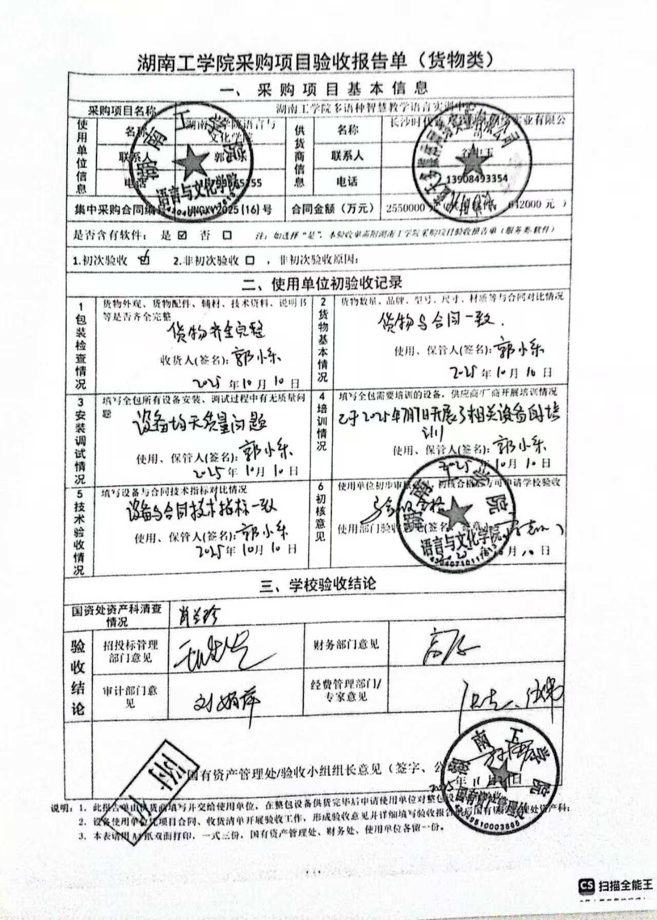 根据国有资产管理处对采购项目的验收安排,2025年11月14日国有资产管理处组织招投标管理与服务中心、审计处、财务处、教务处、智慧校园建设与管理中心以及使用部门代表对供应商的项目进行现场验收。