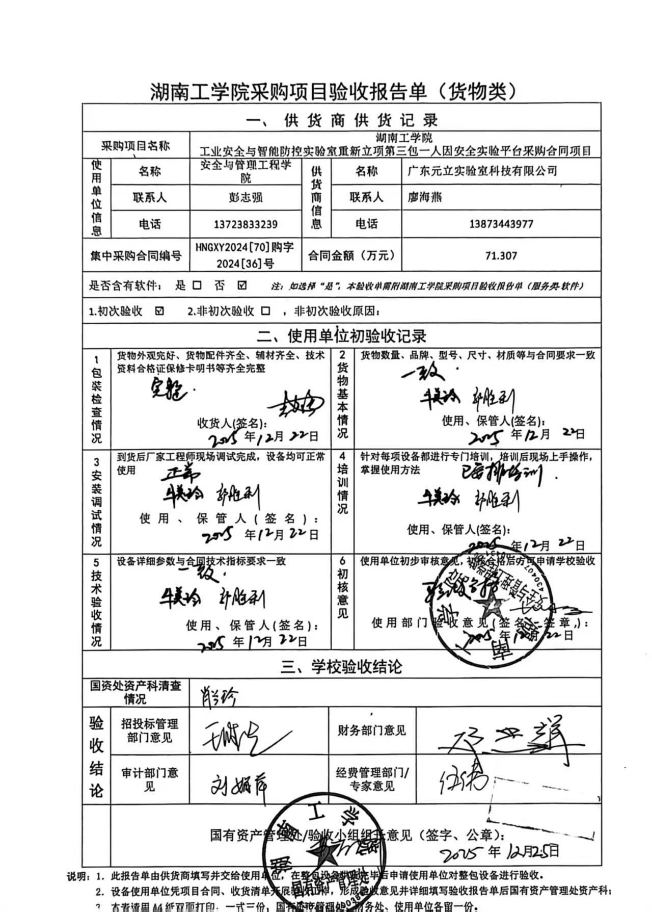 2025年12月关于HNGXY2024【70】号 购字2024【36】号采购项目验收情况公告