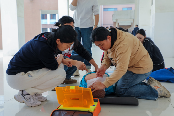 在实践学习环节中,学员们分组进行了模拟急救情景演练。在讲师的指导下,老师们学习了如何判断患者是否需要急救、进行胸外按压和人工呼吸、自动体外除颤器(AED)的使用等关键步骤。分组演练后,学员们进行了一对一实操考试。