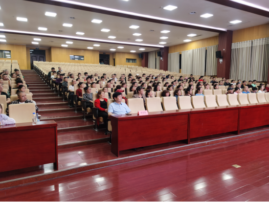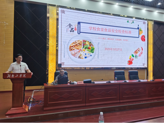 为提升校园食品安全水平,加强校内餐饮从业人员的专业能力,best365后勤基建处,国有资产管理处联合衡阳市市场监督管理局于2025年3月27日晚开展食品安全培训,衡阳市食品监督科科长蒋受楚受邀参与,校内食堂、经营性门面全体从业人员参与,约300人到场。