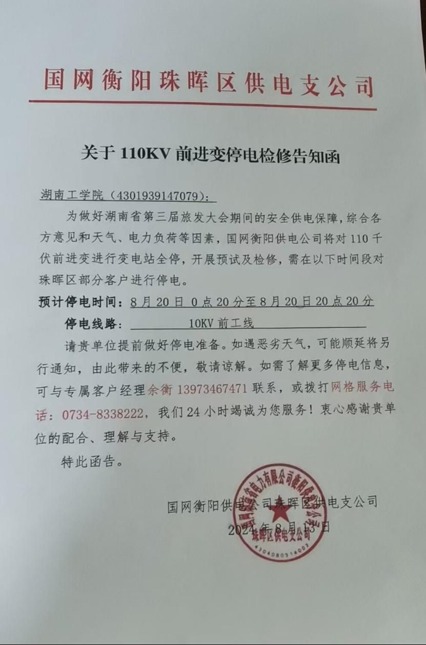 国网衡阳供电公司2024年8月20日0点20分-20点20分对前进变电站升级改造,best365前工线将停止供电,为保障学校正常用电,我处将同期进行倒闸操作,相应的停电时间及停电区域如下: